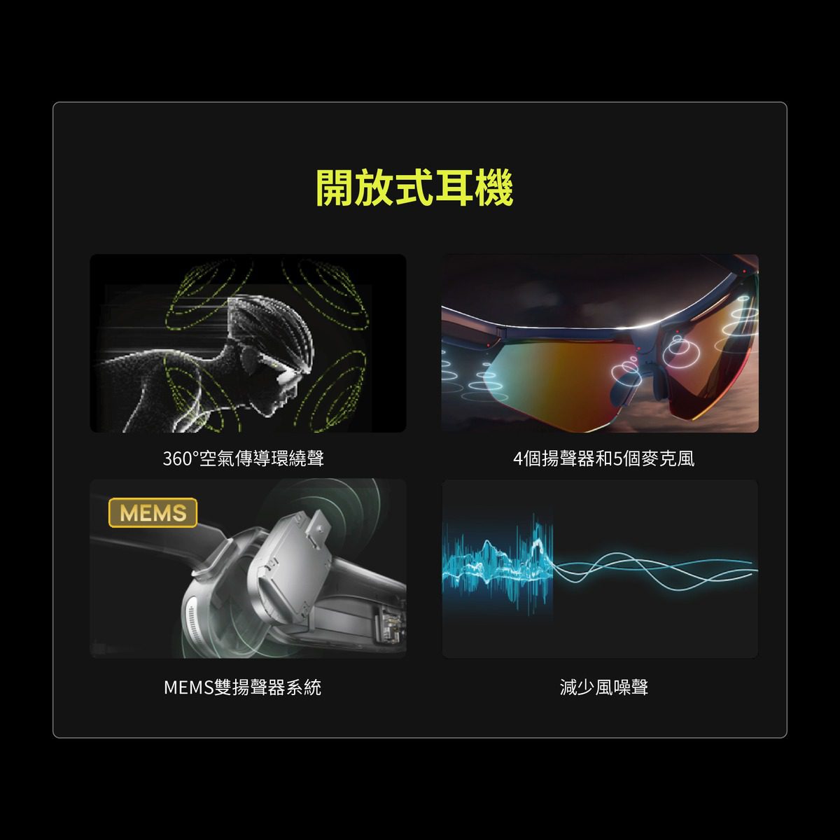 - 優質音頻:4 個揚聲器(2 全頻 + 2 高頻)、開放式外部揚聲器(更安全,不壓耳)、5 級麥克風降噪、運動數據語音播報。