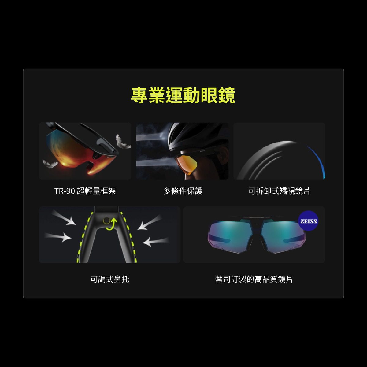 - 眼部保護:UV400 抗紫外線鏡片(部分型號 Zeiss 鏡片)、IP54 防水防塵、防霧、可更換近視/遠視鏡片插片。
