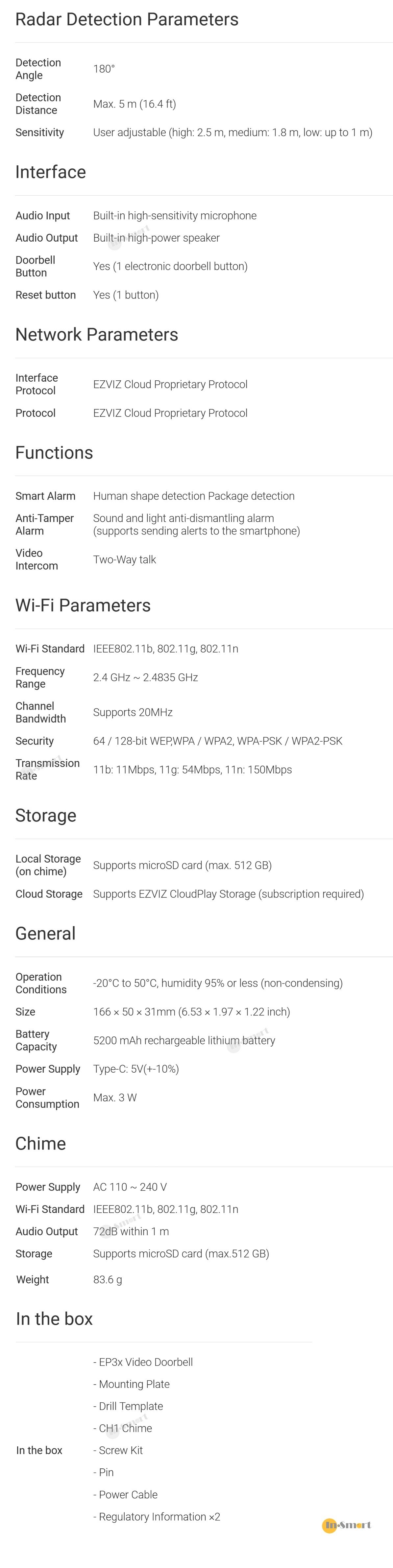 如果您想透過手機監控大門保安,請選擇最新的 EP3X。由於其創新的雙攝影機設計,EP3X 可讓您看到訪客在門前以及放在地面的包裹,所有這些畫面都同步監看,甚至是在遠端進行。這款二合一設備結合了相機和門鈴功能,可以全天候 24 小時守護您的家,能夠偵測訪客並提醒您有訪客到來、發送送貨員的視訊電話,以及播放配對鈴聲和悅耳的鈴聲。EP3x 100% 無需電線,由內置充電池供電,可以輕鬆設定和使用。 (In-Smart 版權所有, 不得抄襲)