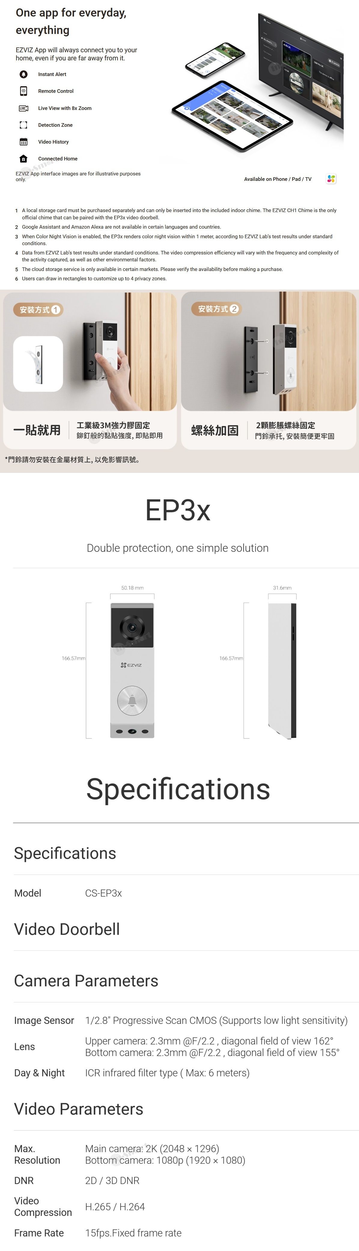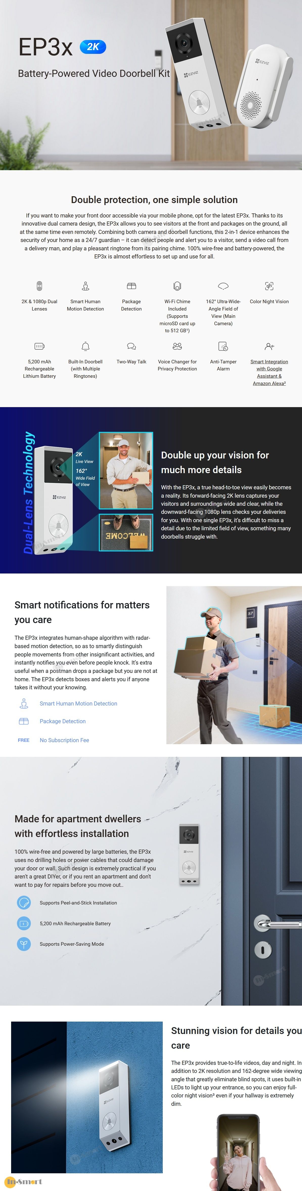 如果您想透過手機監控大門保安,請選擇最新的 EP3X。由於其創新的雙攝影機設計,EP3X 可讓您看到訪客在門前以及放在地面的包裹,所有這些畫面都同步監看,甚至是在遠端進行。這款二合一設備結合了相機和門鈴功能,可以全天候 24 小時守護您的家,能夠偵測訪客並提醒您有訪客到來、發送送貨員的視訊電話,以及播放配對鈴聲和悅耳的鈴聲。EP3x 100% 無需電線,由內置充電池供電,可以輕鬆設定和使用。 (In-Smart 版權所有, 不得抄襲)