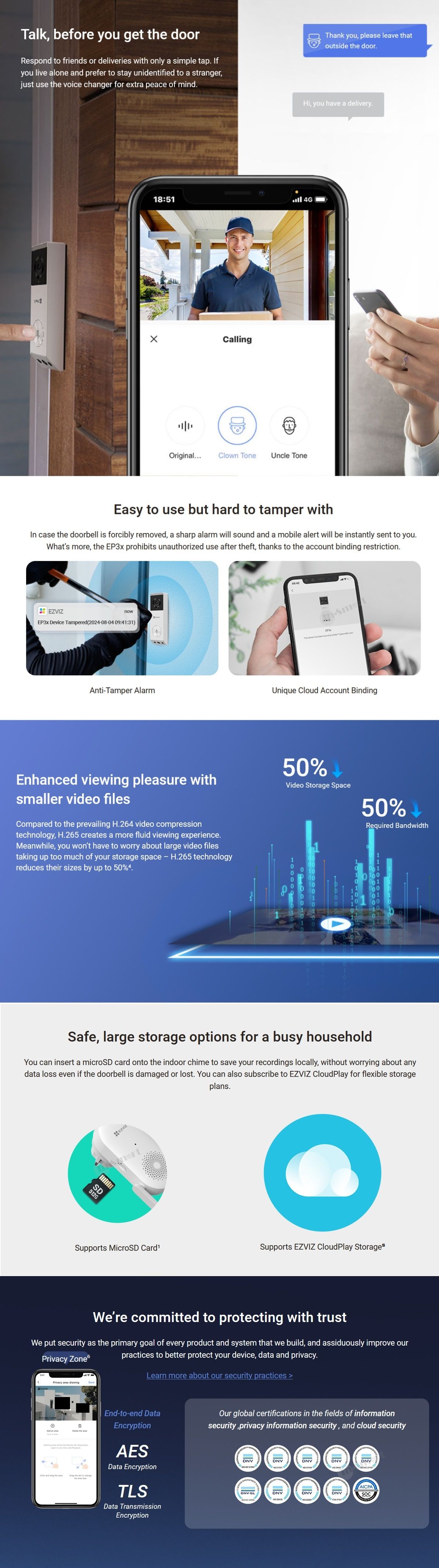 1 本地記憶卡需另外購買,且只能插入隨附的室內門鈴。 EZVIZ CH1 Chime 是唯一可與 EP3X 視訊門鈴配對的官方門鈴。