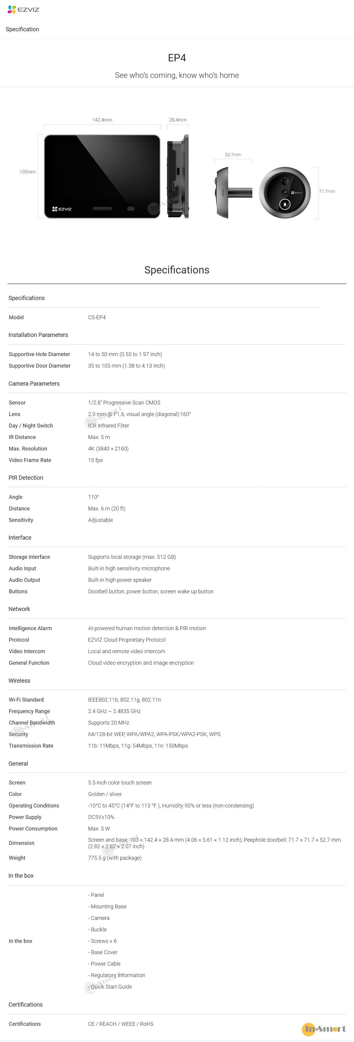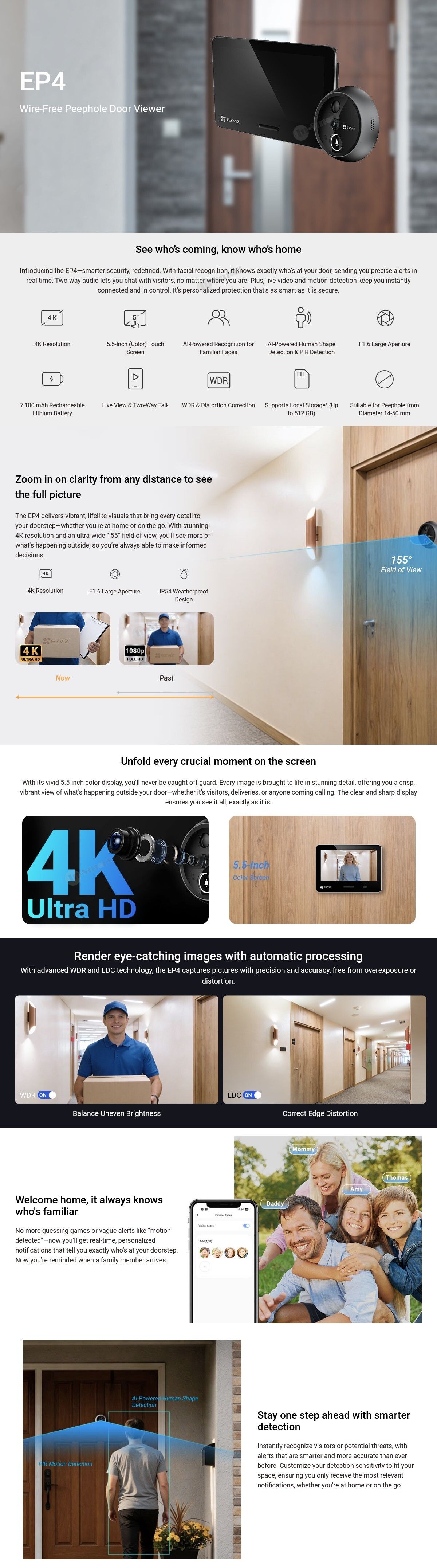 Ezviz – EP4 4K 全無線智慧貓眼攝像頭連門鈴 AI 人工智慧辨識功能 5.5″ 彩色觸控屏幕 6米 PIR 智能人體感應 內置 7100mAh 充電池 IP54 防風雨 5米紅外線夜視