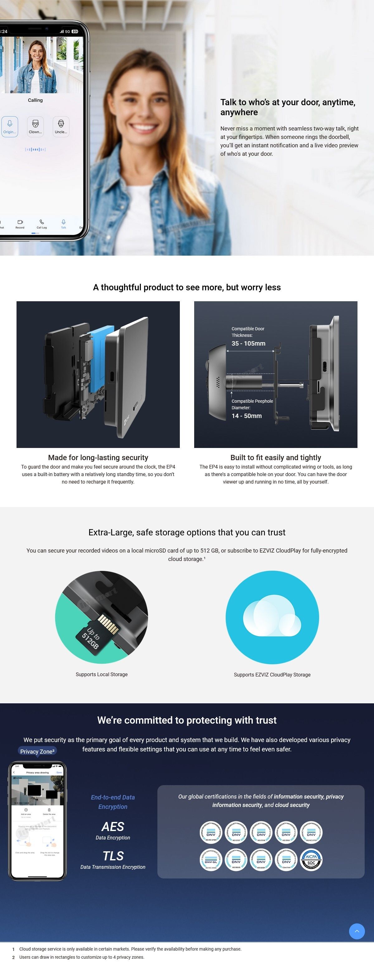 • 支援高達 512 GB 的記憶卡或 EZVIZ CloudPlay 加密雲端儲存