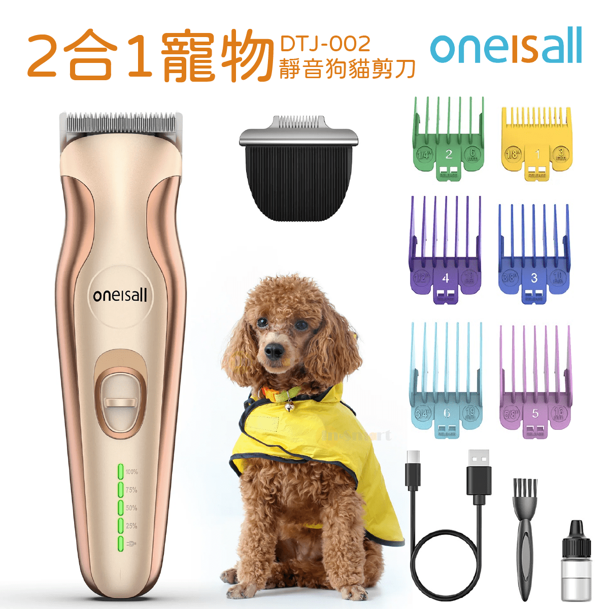 狗狗毛髮太長,除了平時可見的身體、臉上這些明顯的位置外,爪子的毛髮也會生長,而且很難剪,Oneisall推出的2合1寵物剪毛器─DTJ-002,備有兩種刀片,分別專為厚長區域毛髮及爪子,眼睛等狹窄位置而設,輕鬆剪毛。