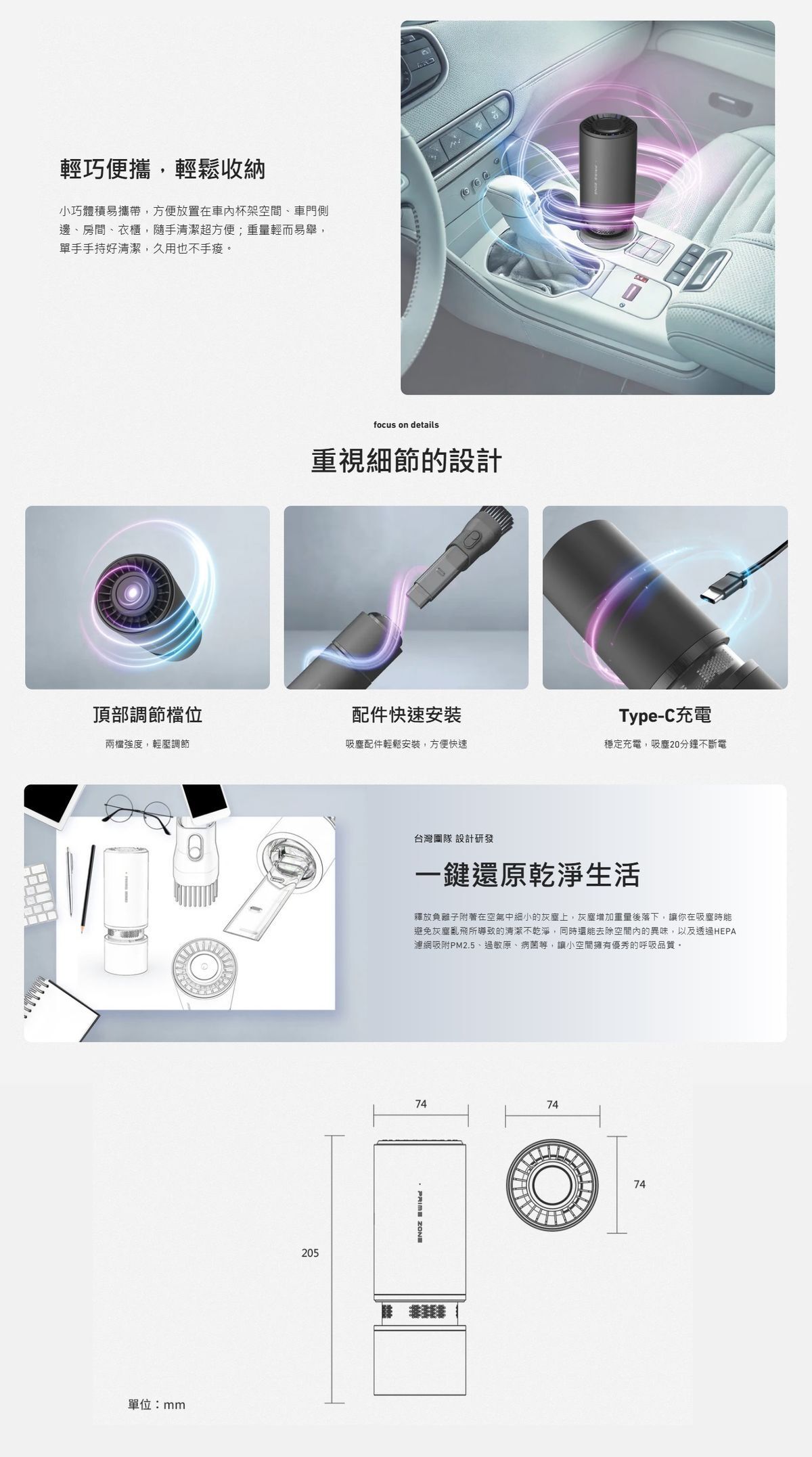 ・產品重量: 主機 690g、二合縫隙吸嘴 43.5g、Type-C 充電線 35g