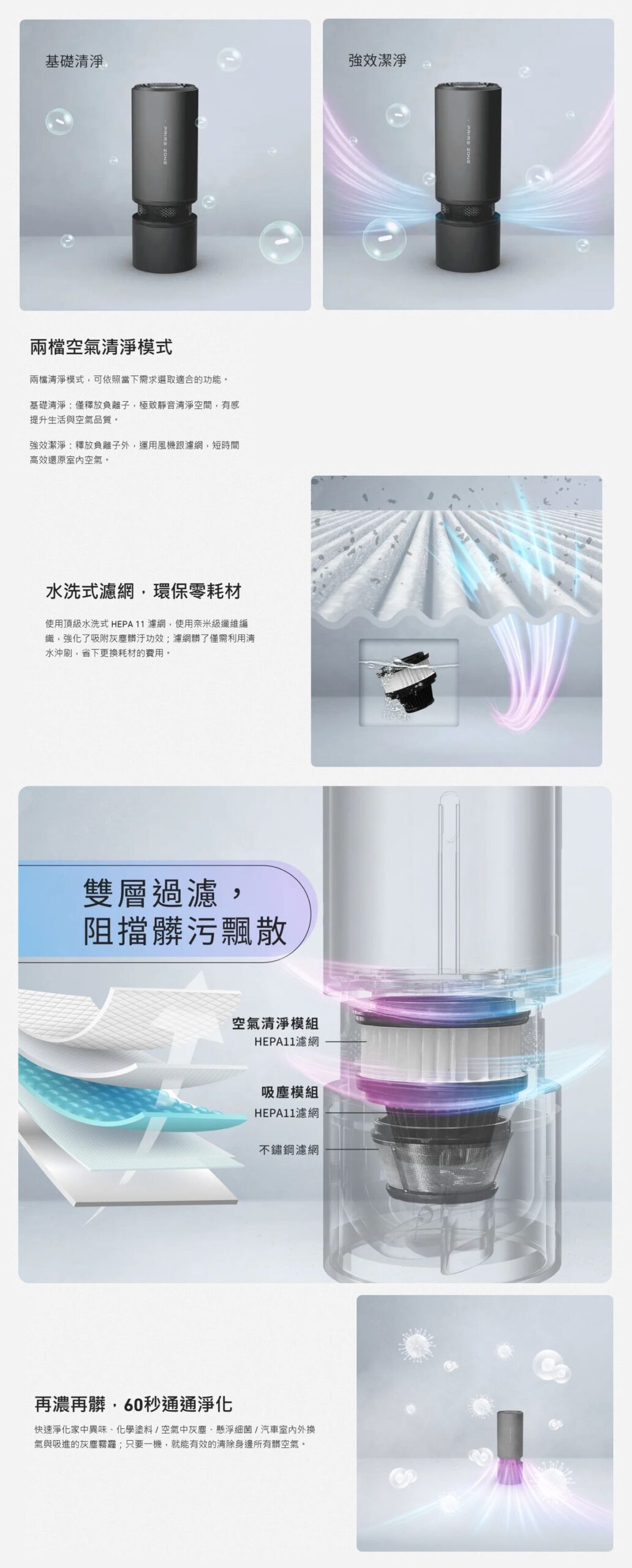 ・空氣清淨與強力吸塵完美結合,強迫灰塵落下,避免髒汙漫天飛。