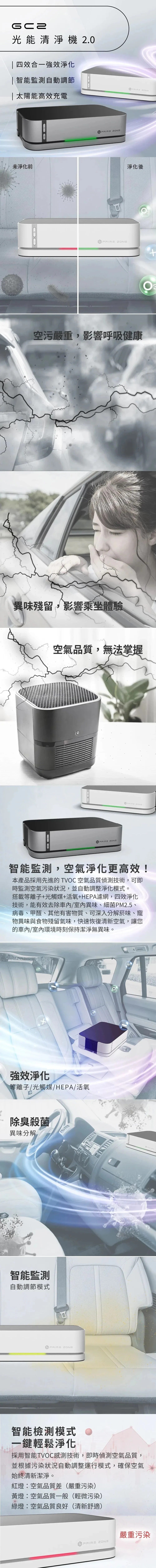 GC2 是第二代光能清淨機,提升了光觸媒和等離子功能,能有效清淨空氣中的有害物質,搭配原有的活氧功能和雙風機設計,實現三重淨化,消除異味。太陽能面板面積增大50%,充電效率提升。