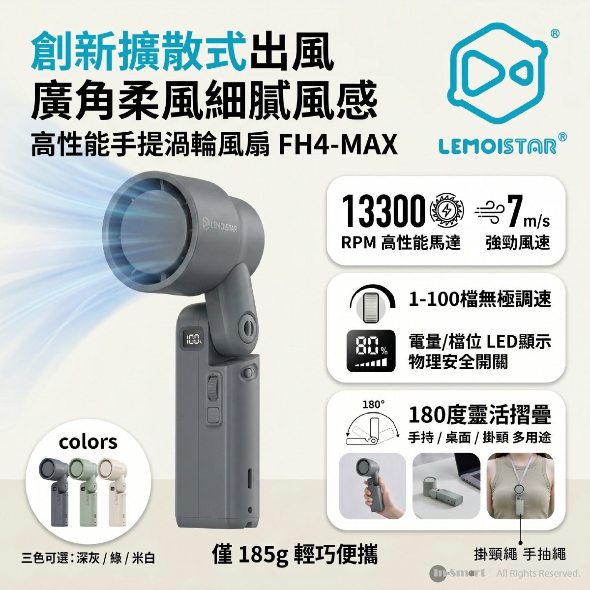 FH4-MAX 重新定義手提風扇!獨家擴散式出風技術,讓 7m/s 的強勁渦輪風不再刺面,風感細膩舒適。具備 100 級無極調速與 180 度靈活摺疊設計,手持、案頭或掛頸皆可。輕量 185g 隨附安全鎖扣,是您夏日通勤與旅行的頂級消暑裝備。