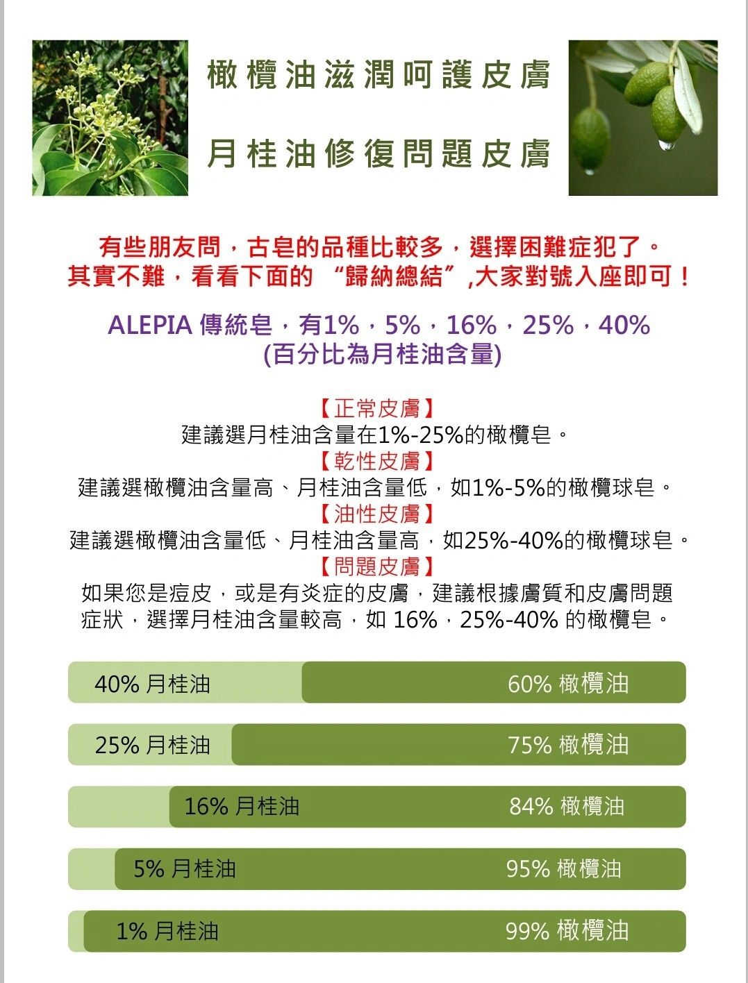 | 商品簡介 | Alepia 25% 月桂油 + 75% 初榨橄欖油 古皂 190g  |