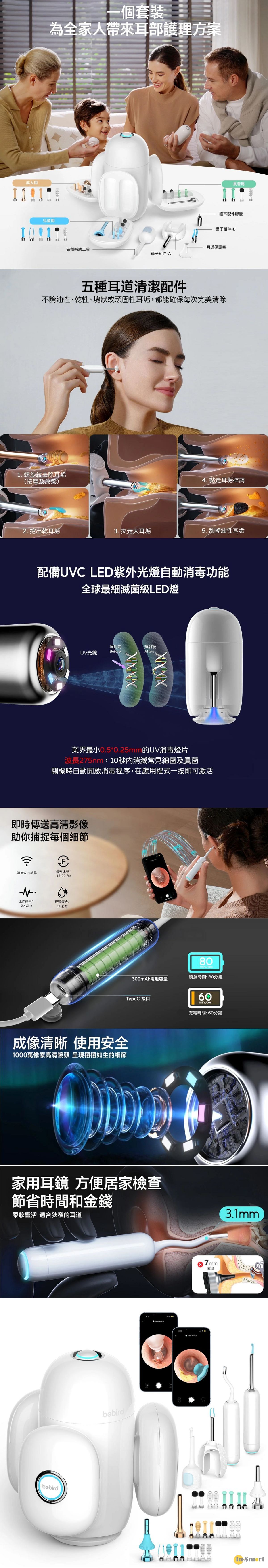 Bebird Home 30S專為家庭設計的耳道護理工具,適合全家使用。兒童、成人和長者的耳道在尺寸和形狀上差異很大,使用不合適的耳挖可能會造成損傷。全新推出的Home 30S配備三組獨立的配件,每組針對不同年齡層設計,結合防水鏡頭,讓耳道清潔變得「可視式」,確保安全、輕鬆和潔淨。