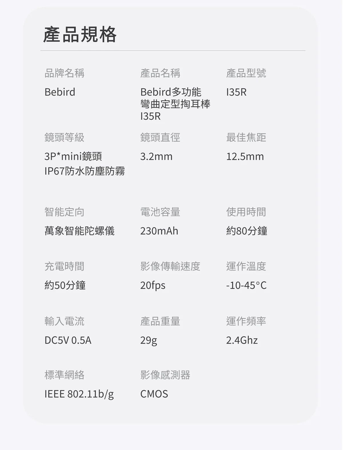 Bebird全新推出多功能彎曲定型I35R,可視式掏耳棒,專業級高清3P內視鏡,穩定傳輸,讓耳道清潔更加潔淨,耳棒標示了刻度,讓用家了解耳道深淺,防止耳道受損。