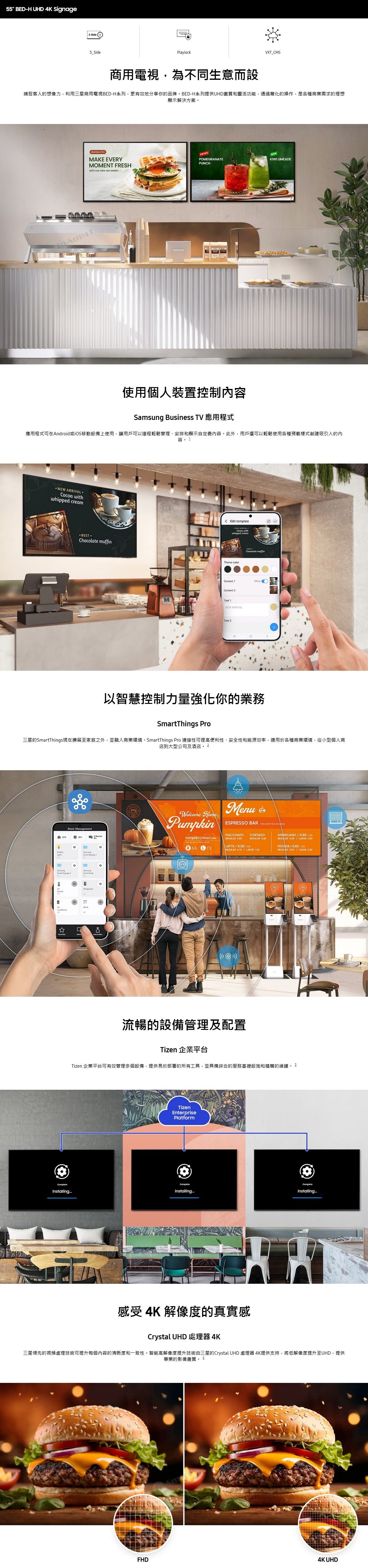 捕捉客人的想像力,利用三星商用電視BED-H系列,更有效地分享你的品牌。BED-H系列提供UHD畫質和靈活功能,通過簡化的操作,是各種商業需求的理想顯示解決方案。