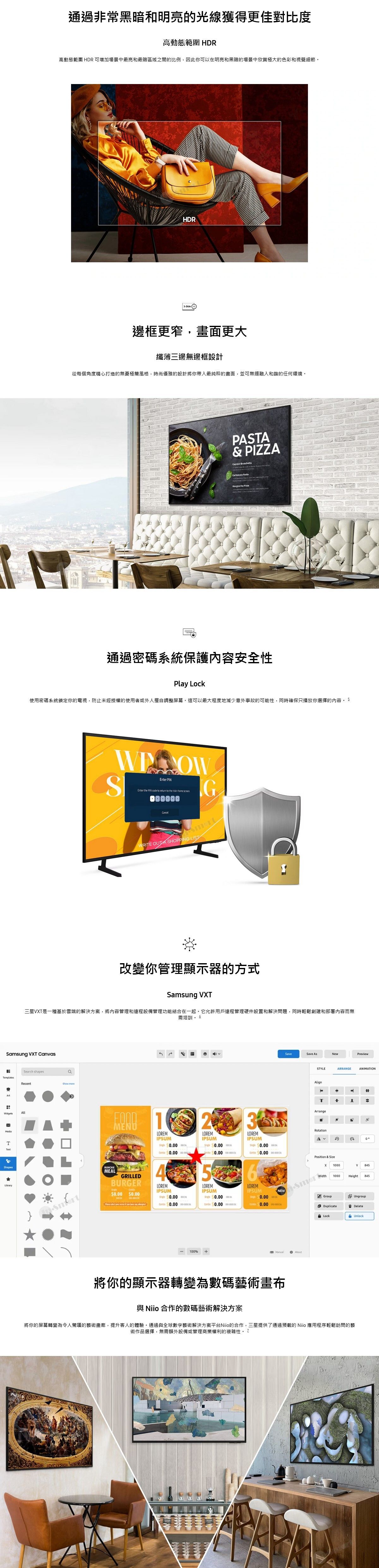 捕捉客人的想像力,利用三星商用電視BED-H系列,更有效地分享你的品牌。BED-H系列提供UHD畫質和靈活功能,通過簡化的操作,是各種商業需求的理想顯示解決方案。