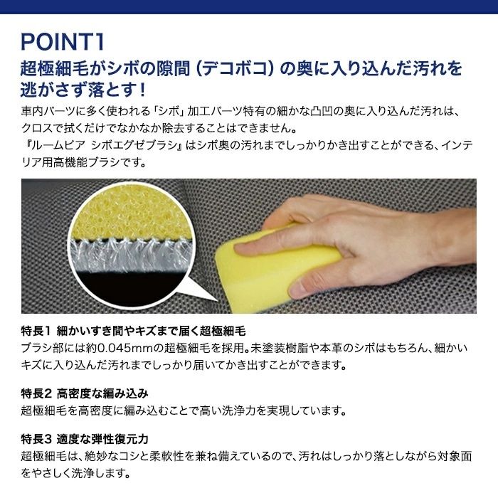 專為清潔車內凹凸部位設計的刷具,有效去除及深入門板紋理、真皮座椅紋路中的防曬乳、泥土、沙塵及飲料殘留等頑固污垢。