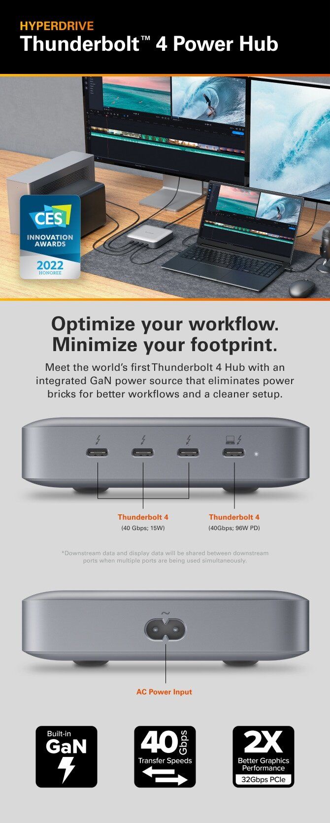 世界上第一個具有集成 GaN 電源的 Thunderbolt4 集線器,無需電源磚,從而實現更好的工作流程和更清潔的設置。