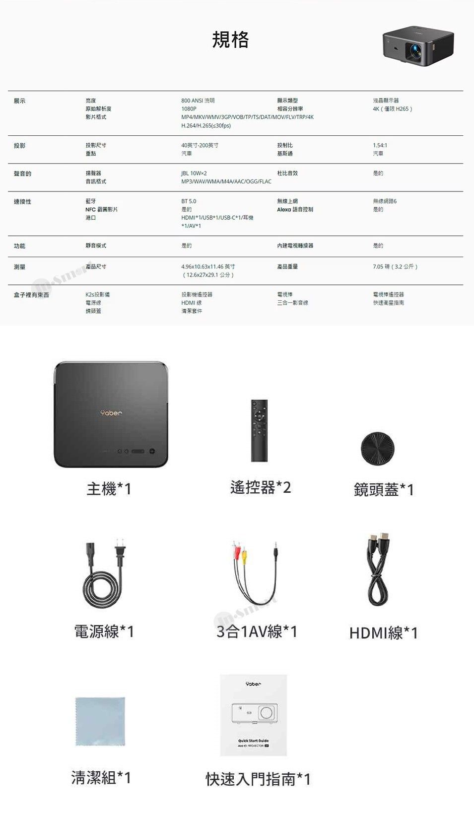 Yaber – K2S 影院級4K旗艦投影機 JBL 認証 10W 立體聲揚聲器 杜比音訊支援 800 ANSI 流明 Android TV