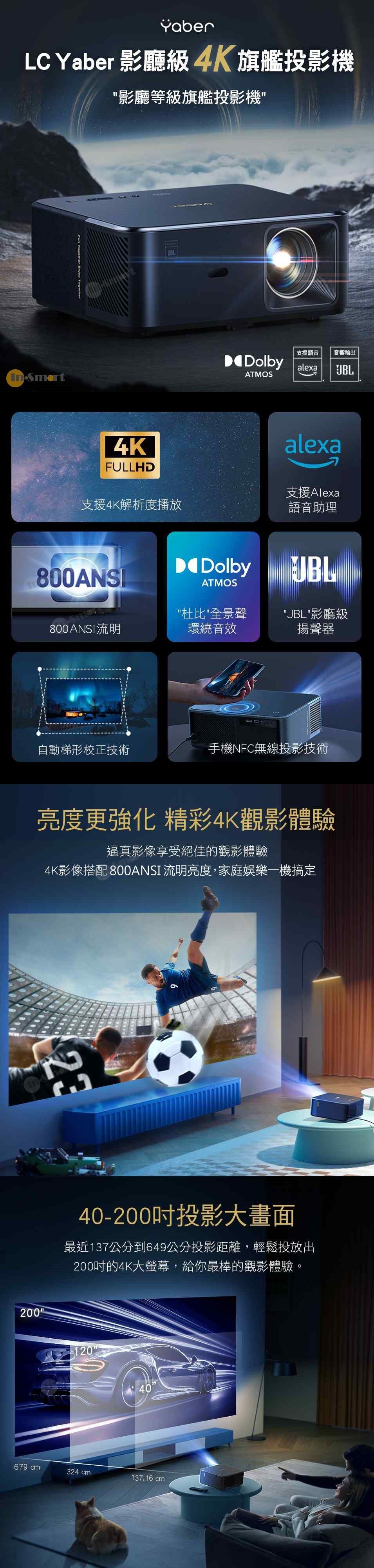 • 40-200 吋投影大畫面