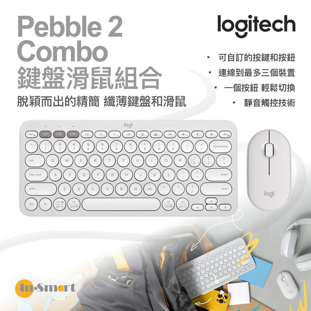 使用回收塑膠製作的纖薄、輕盈、精簡設計 1Pebble 2 滑鼠鍵盤組合塑膠材料Pebble Keys 2 K380 S 至少包含 49% 回收塑料,Pebble Mouse 2 M350 S 至少包含 58% 回收塑料,不包括印刷線路板組件 (PWA) 和包裝。