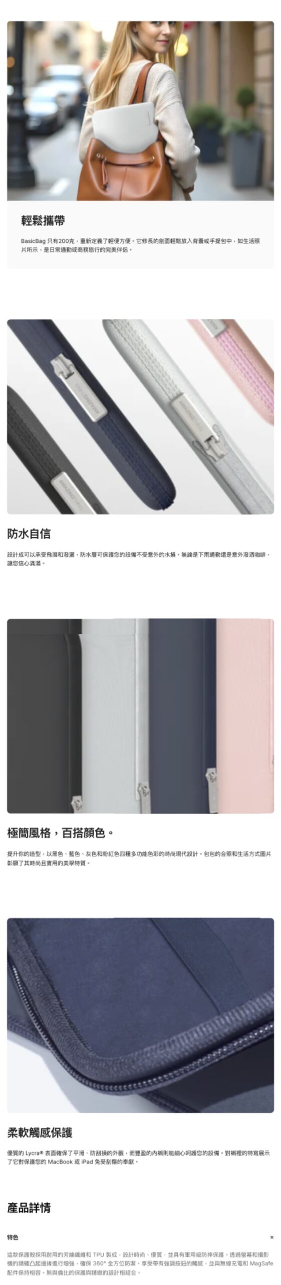 BasicBag 外型簡約輕巧且具保護性,以纖薄設計和防水萊卡表面帶來日常便利。完美適合您的 MacBook 或 iPad,兼具實用性與時尚感,是追求簡約與功能性人士的理想選擇。
