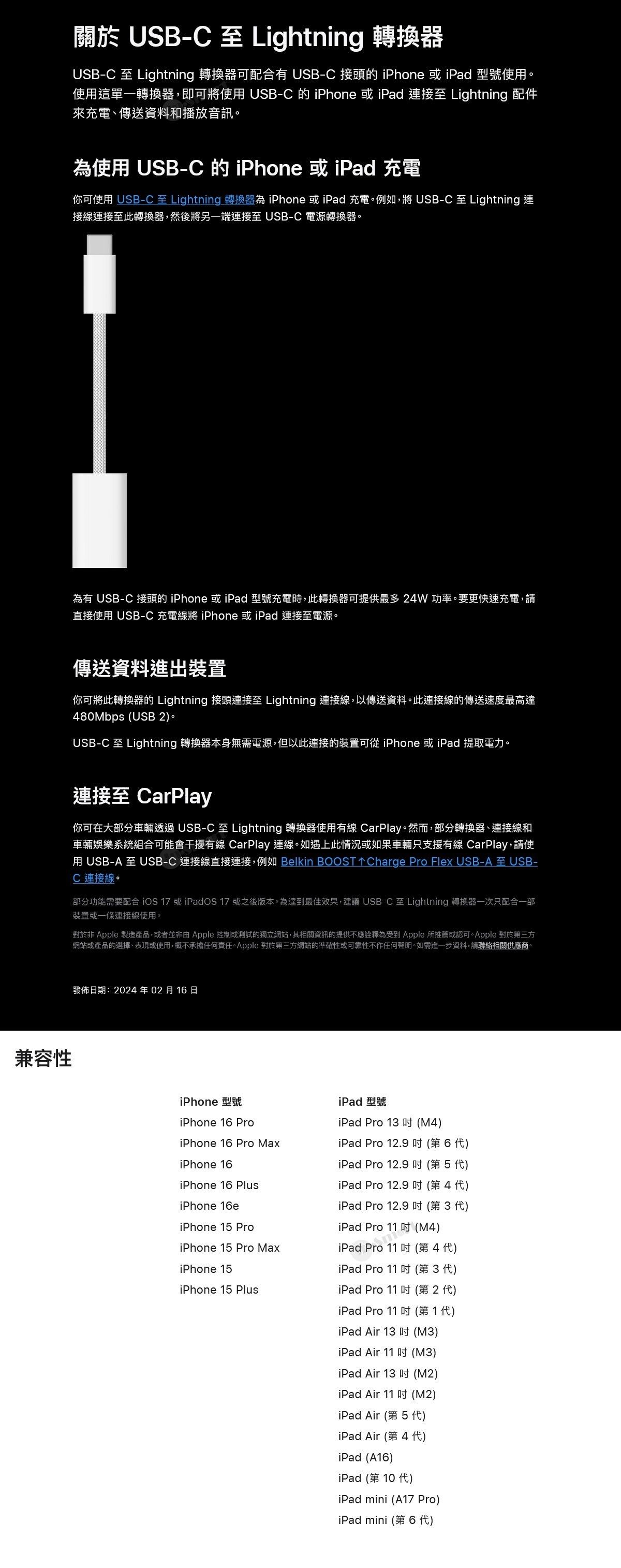 USB-C 至 Lightning 轉換器讓你將 Lightning 配件連接至支援 USB-C 的 iPhone 或 iPad,只需單一個轉換器,即可帶來三大主要功能,輕鬆進行充電、數據傳輸及音訊輸出。轉換器採用編織連接線,更為堅固耐用。
