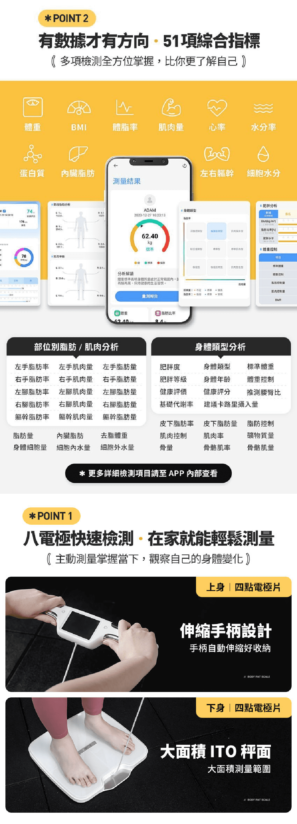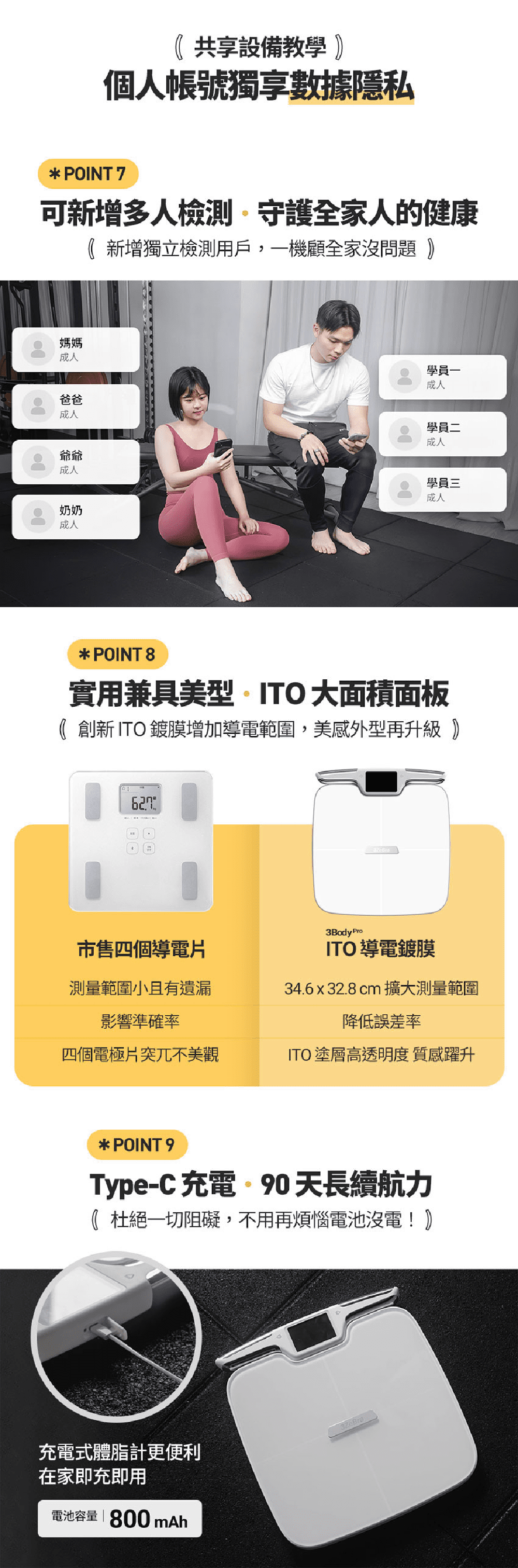 獲得的數據後,3Body Pro會為用家進行身體分析,告知你的身體類型,並提供改善方向,讓你擁有明確的目標。普通體脂磅一般只使用4塊導電片,很容易因位置偏差而數據錯誤,而3Body Pro整塊ITO面板都是導電範圍,將誤差降到最低。