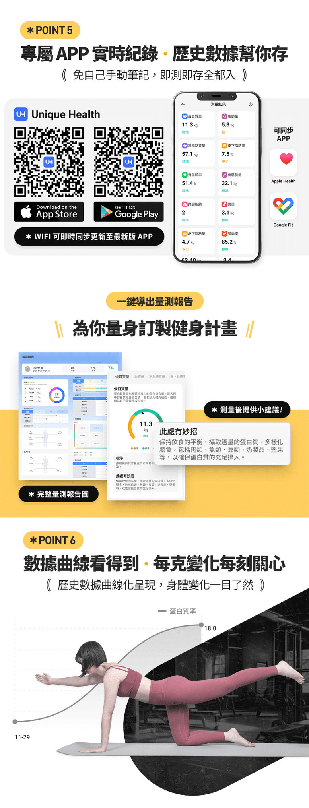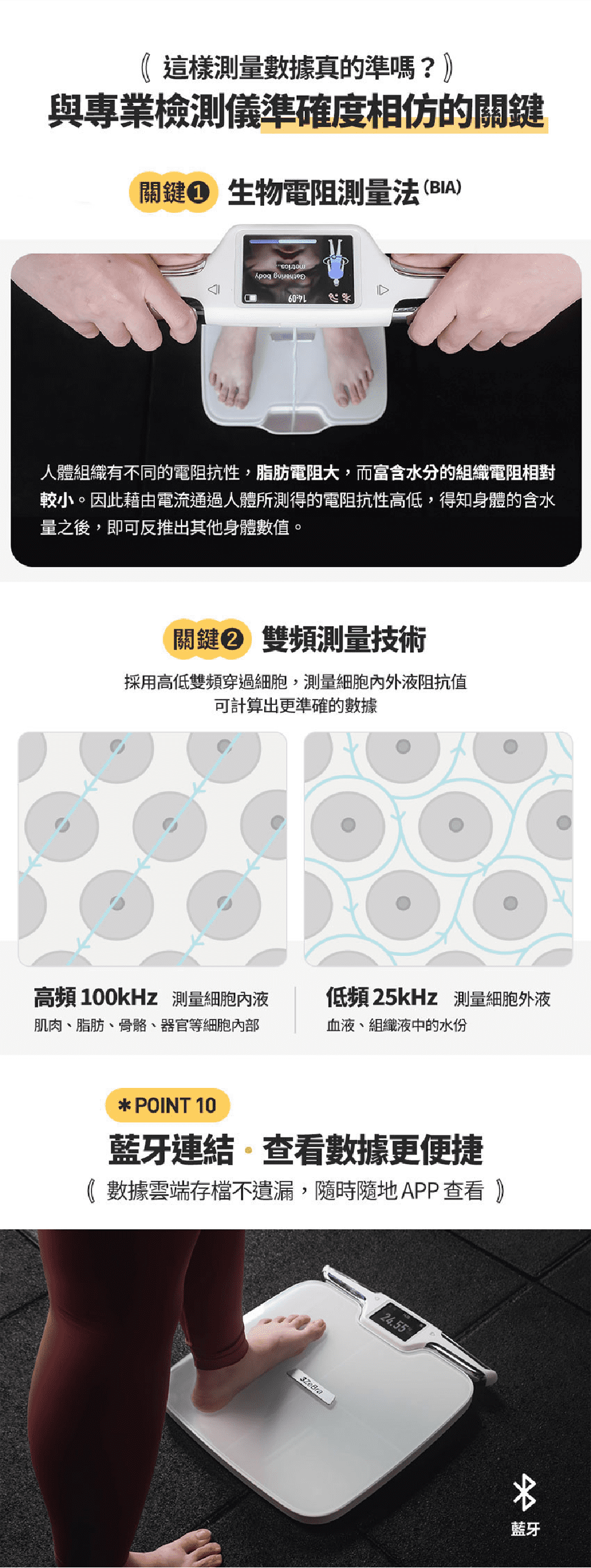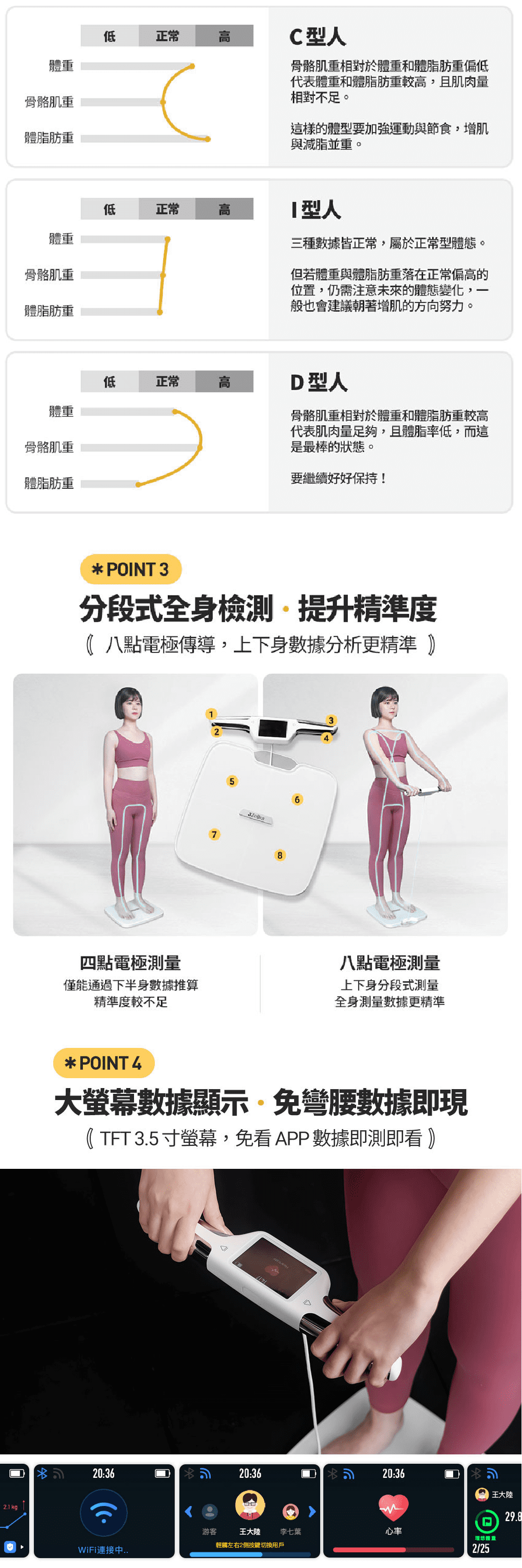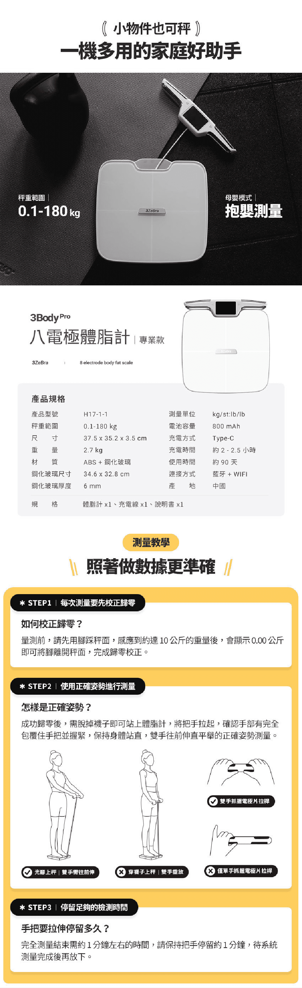健身人士必備的體脂磅,擁有包括:體脂、肌肉量、蛋白質、細胞水分在內的51項指標檢測,滿足健身人士所需數據,與普通體脂計使用四點電極傳導不同,3Body Pro採用八點電極傳導,可以上下身分段式測量,獲得更精準的身體數據,避免因數據錯誤而訂立錯誤的健身計劃。 WIFI 連接自動同步最新版 APP,時刻保持最新版本 (Apple IOS / Android Google Play)
