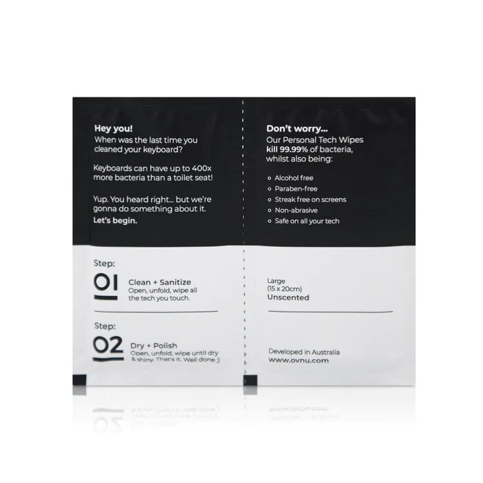 OVNU 二合一消毒濕紙巾適用於任何電子設備,一乾一濕的組合不單能迅速去除污漬及殺滅99.999%細菌,更不留抹痕及擦亮表面,令設備保持光潔如新。獨立包裝方便攜帶,不論在旅途中還是在辦公室工作,都可以隨時隨地使用,全天候守護你的電子設備。