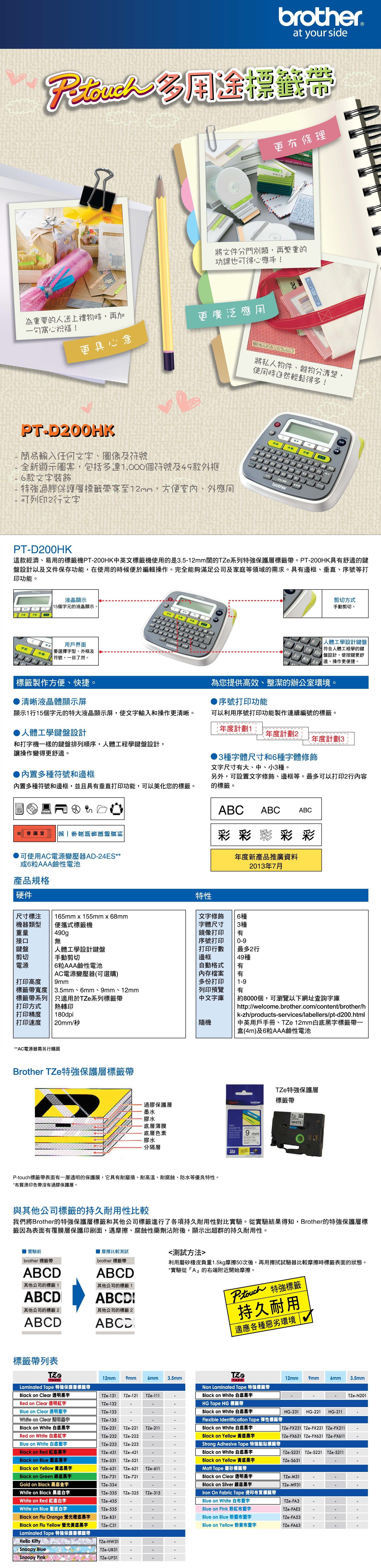 明確標示物件能增加工作效率,例如CD盒,存檔文件夾,貨架,員工/訪客姓名徽章和其他項目,P-touch D200設計輕巧易用,能輕鬆快速地製作標籤。加上Brother備有各式各樣不同寬度和顏色的標籤帶,使P-touch D200成為不可或缺的好幫手。