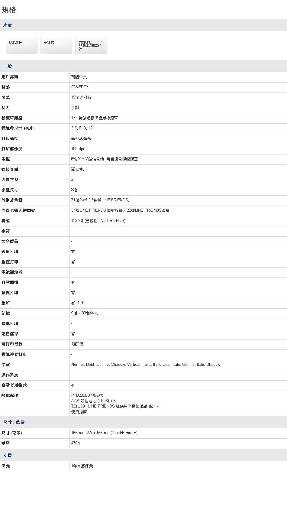 PTD200LB 提供34種超可愛的LINE FRIENDS圖案設計,22種LINE FRIENDS邊框。創製獨特的LINE FRIENDS標籤,真是容易之極! 機身細小,可以單手攜帶,或放在任何地方使用。電腦式鍵盤,既熟悉,又易用。輸入文字之後,就可以即時列印及貼上。標籤帶是Brother專利的膠帶,可以對抗UV、磨損、水、熱及冷溫,因此你可在冰箱內外使用它。 此外,包裝更包括LINE FRIENDS圖案帶,可製作文具、CD/DVD或兒童物品等標籤。