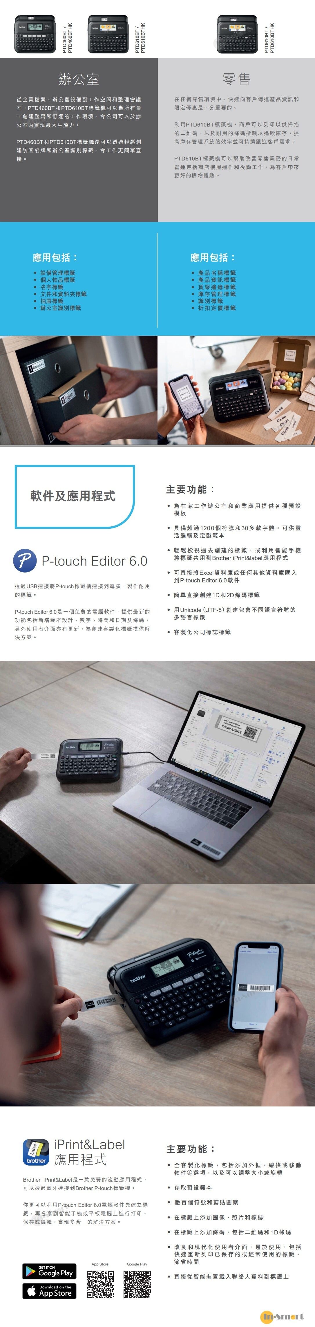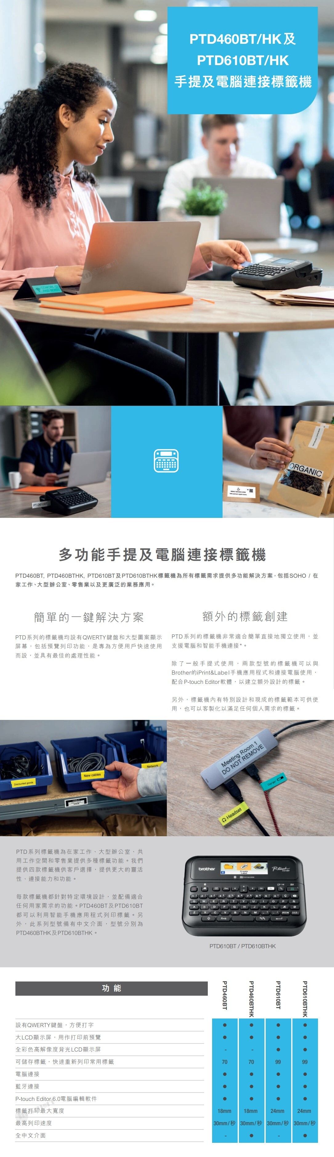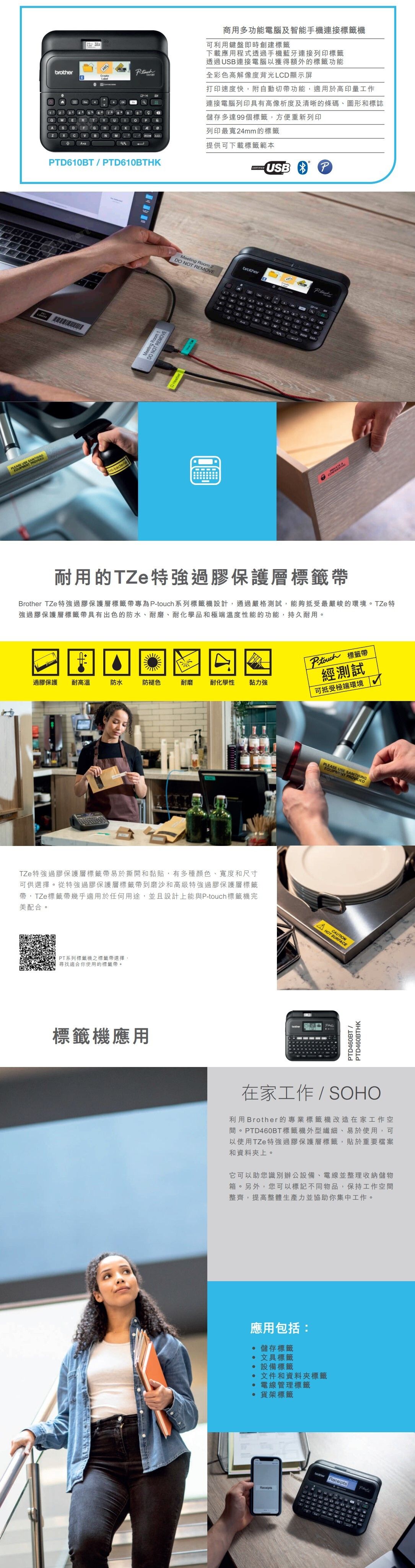 PTD610BTHK 標籤機為所有標籤需求提供多功能解決方案,包括SOHO / 在家工作、大型辦公室、零售業以及更廣泛的業務應用。