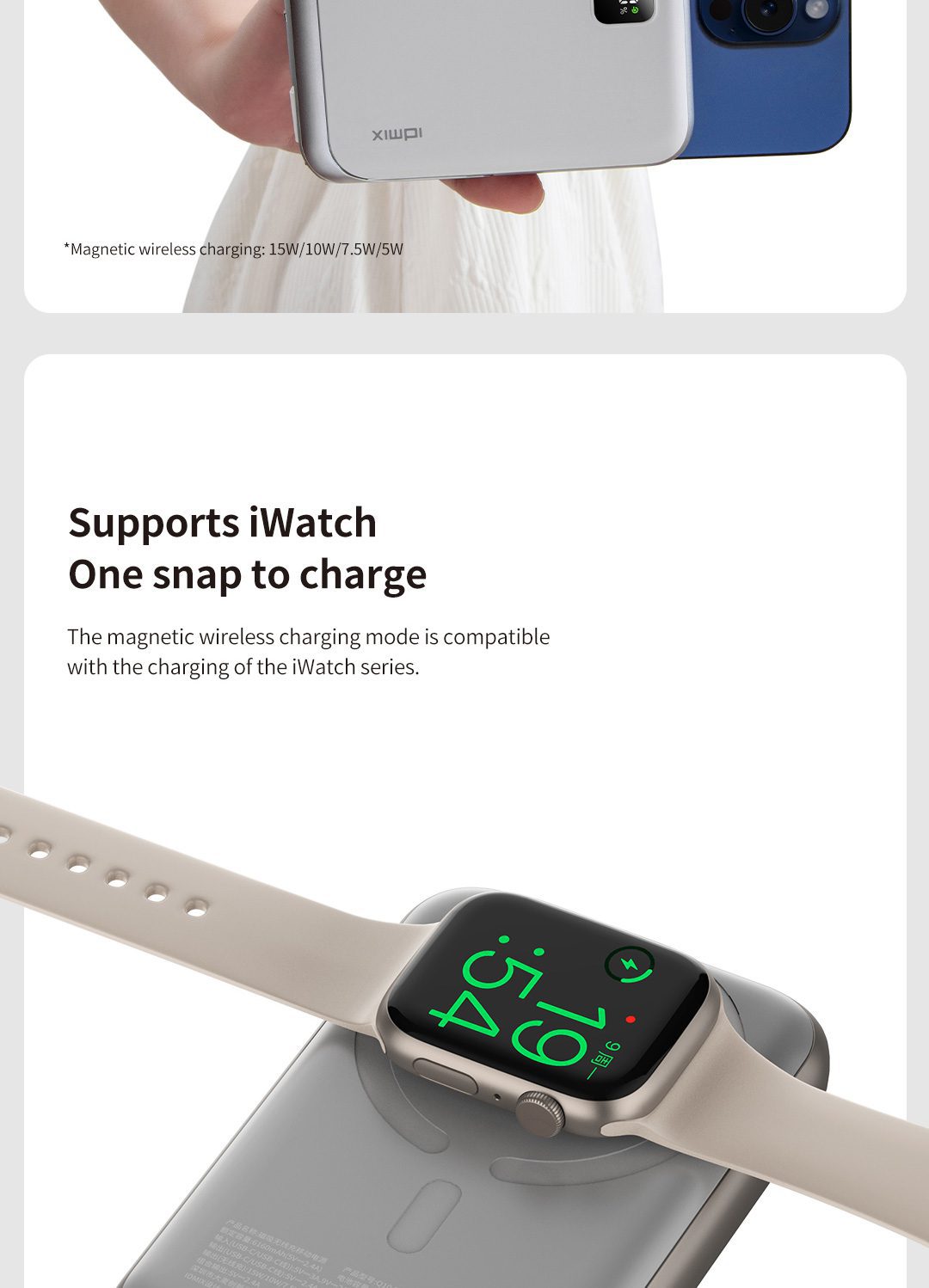 一按即充,磁吸無線充電模式與 Watch 系列充電兼容。