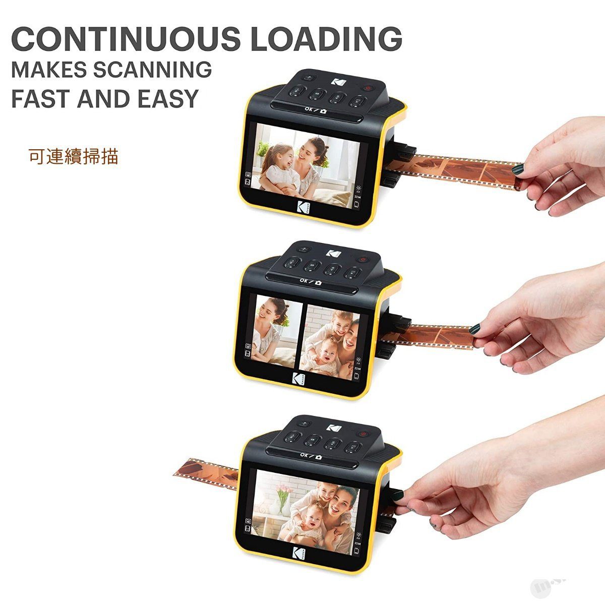 掃描彩色和黑白底片(135、110、126)和 50 毫米幻燈片(135、110、126),以數碼方式永久保存您珍貴的紀念品。內建調整顏色、旋轉圖像等功能,讓珍貴的回憶真正活現眼前,將掃描器以 HDMI 連接到電視,並通過大屏幕以幻燈片放映昔日情懷。