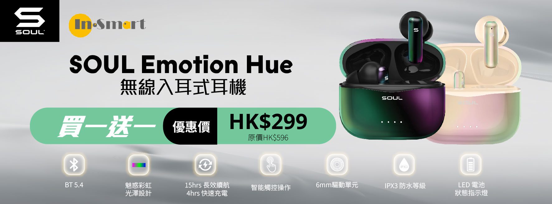 體驗 SOUL EMOTION HUE 無線入耳式耳機帶來的豐富沉浸音效。這款耳機擁有流線型的人體工學設計和先進的藍牙連接,提供直觀的觸控操作和持久的電池續航。