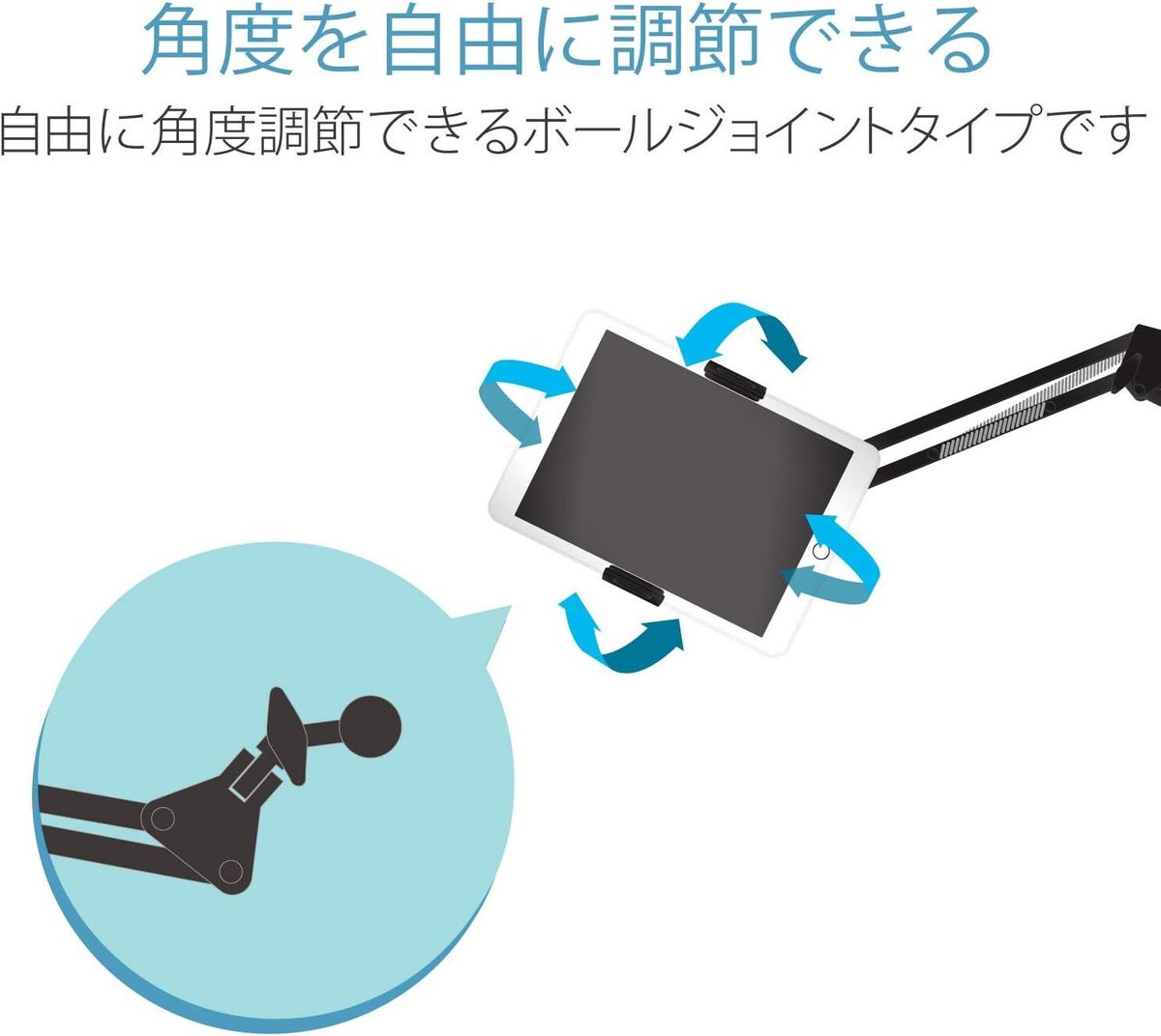 平板電腦支架的連接部分採用球形接頭,可自由調整角度和方向。