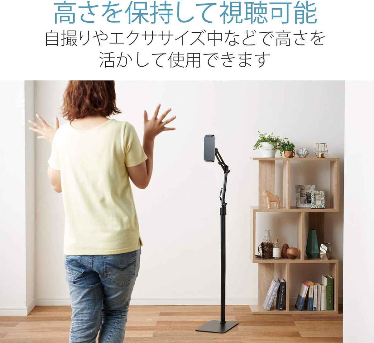 這是一款落地式靈活臂架,可保持其高度,讓您可以在客廳或房間中央使用手機電話或平板電腦。
