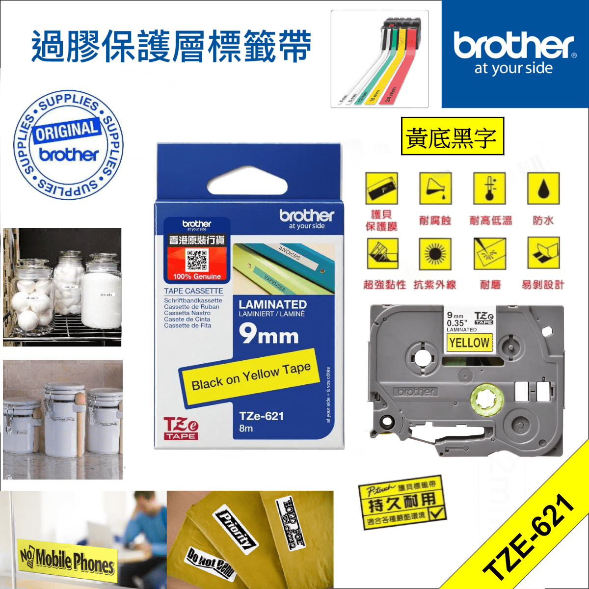 BROTHER – <原廠正貨> 9mm 過膠保護層標籤帶|Brother標籤帶|白底黑字|P-Touch TZe-621 (9mm x 8M)|防水、耐熱、耐磨|不怕紫外線、化學藥品