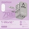 MOMAX – 1-World+ 70W GaN 3插口及內置伸縮USB-C充電線旅行插座 – 灰色 – UA18UKE