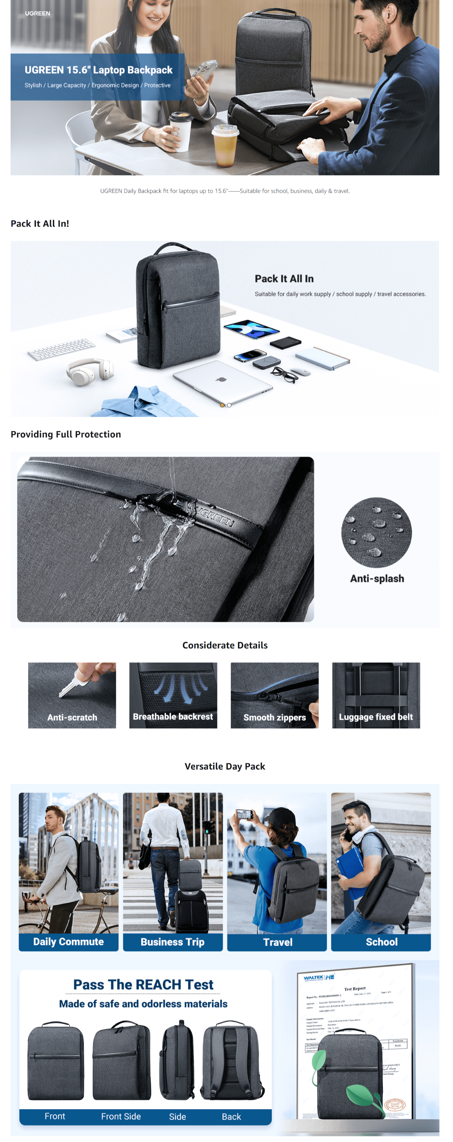 UGREEN LP664 15.6寸筆記型電腦背包,擁有大容量、符合人體工學的設計,適合男女皆宜,採用600D牛津布,具備防震、防水功能,擁有多個口袋,耐用,顏色為深灰色。