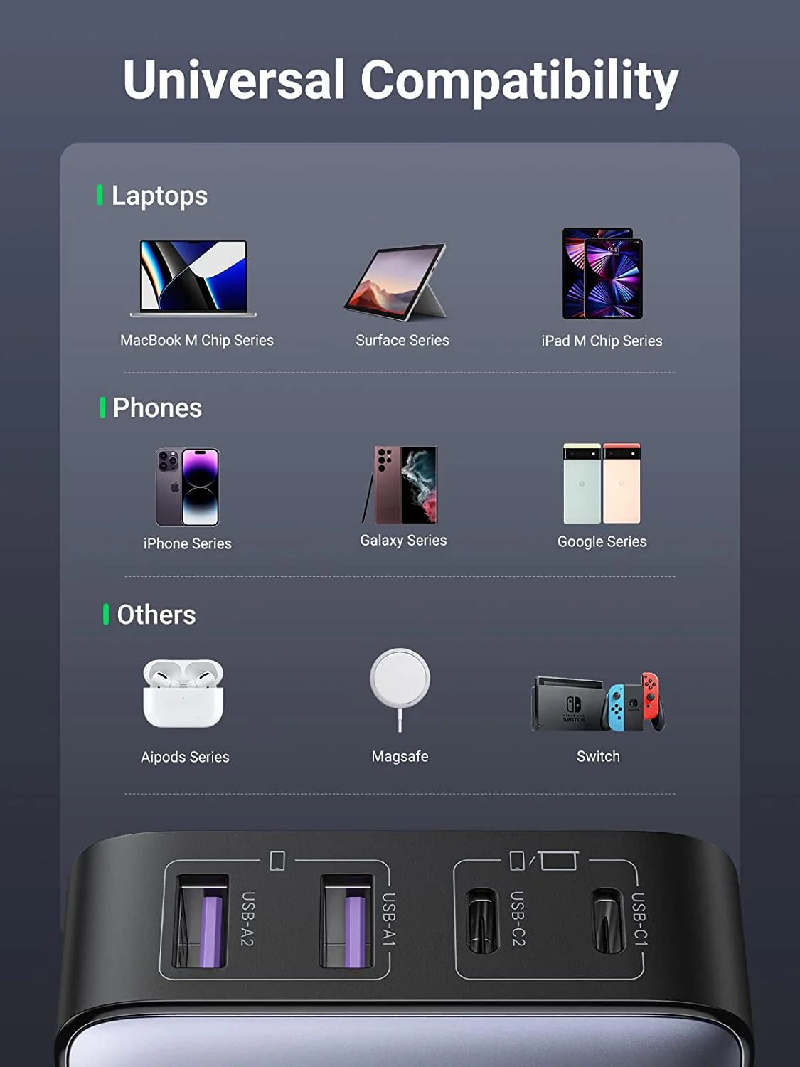 UGREEN Nexode 200W USB-C GaN 充電器是一款緊湊而強大的桌面充電解決方案,旨在提高效率,能夠同時為六個設備充電。