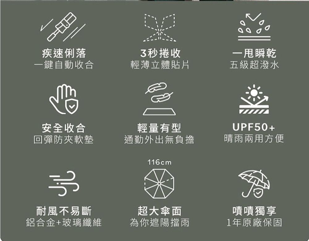 ・高密度防潑水傘布:一甩即乾,收納乾爽不潮溼。