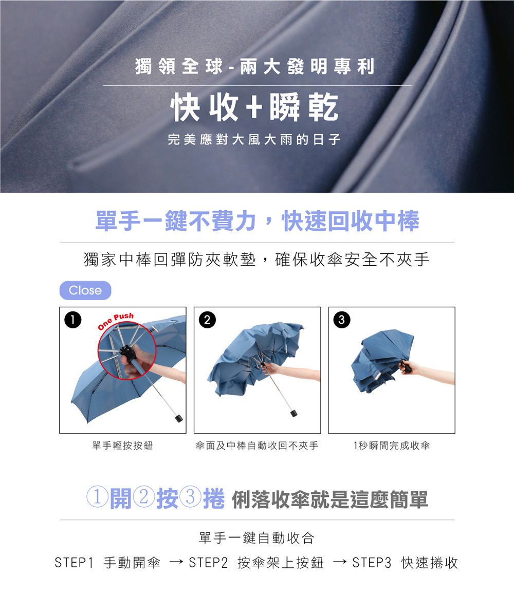 ・全球唯一雙發明專利:快速回收中棒+一鍵收傘,輕鬆收傘。