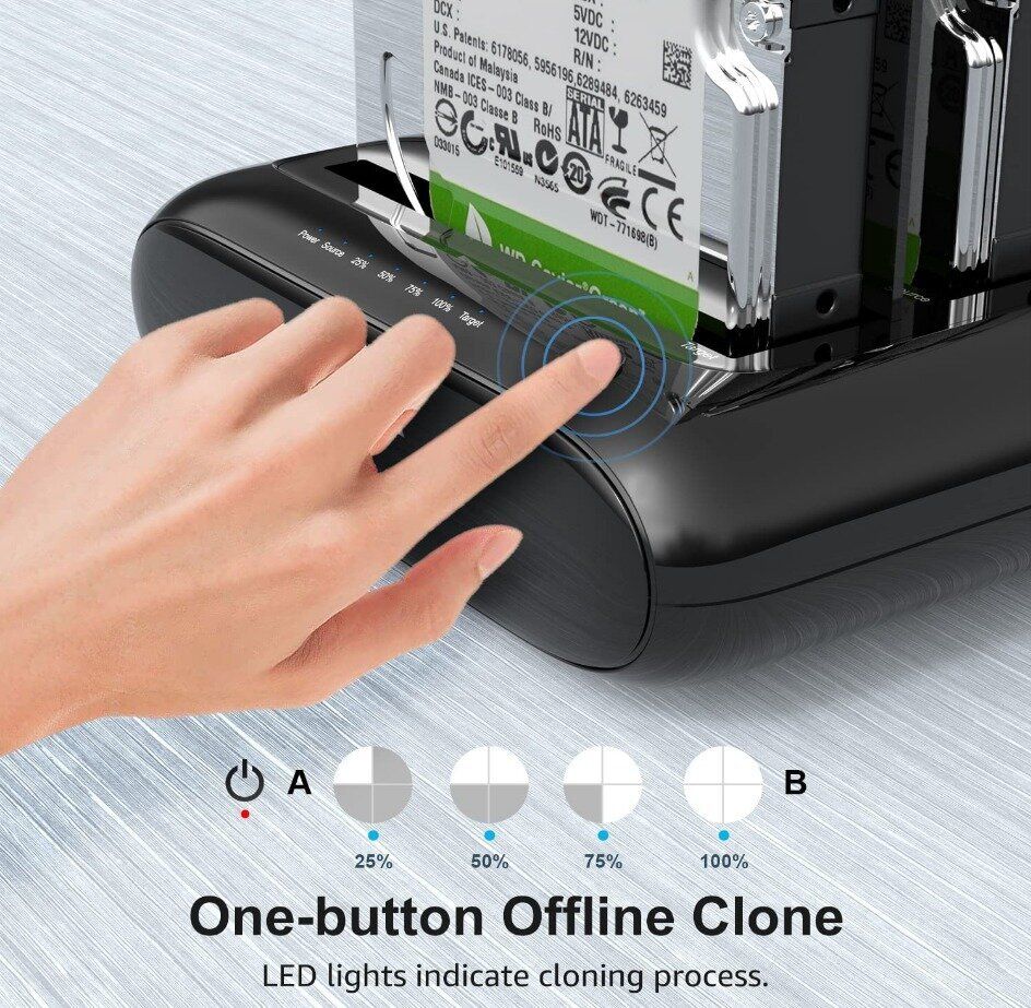 一鍵離線Clone:無需連接電腦,只需一鍵即可將整個硬碟(包括系統與數據)完整Clone至另一硬碟,附有 4 段 LED 進度指示(25%, 50%, 75%, 100%)。
